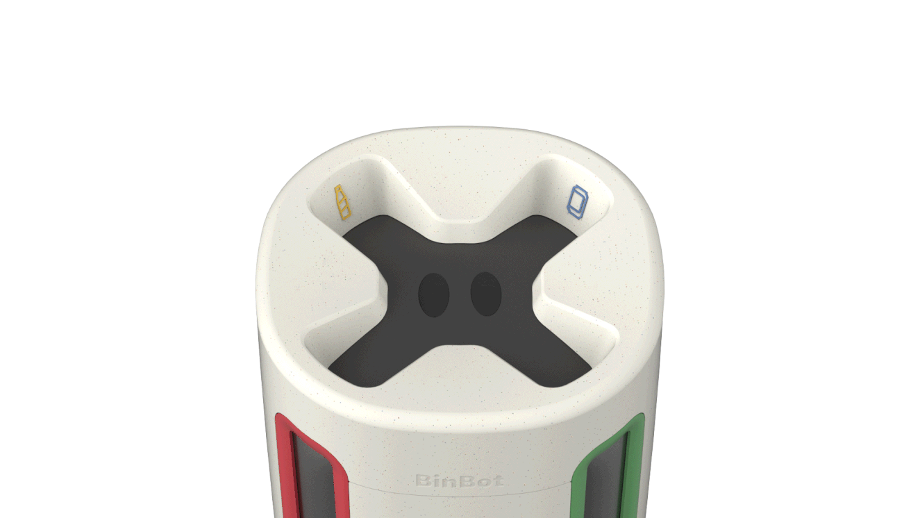 BinBot uses a camera and Ai to detect which object was just thrown away and if it belonged in the right compartment. By using body panels that hook into eachother, the entire device can quickly be assembled and requires less screws or other tools. The lid of BinBot is attached to a hinge which allows for it to easily be lifted up and out of the way. The user then has easy access to all four bin compartments and can easily lift them out with the help of a ergonomically-shaped cutout.